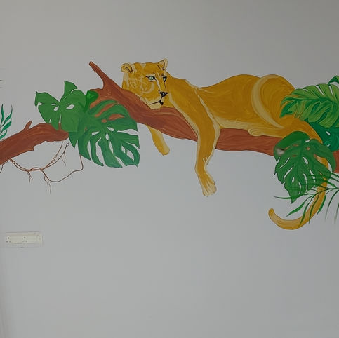 Lively and colorful murals depicting jungle scenes, toucans, leopards, and lions, adding a vibrant touch to indoor spaces.